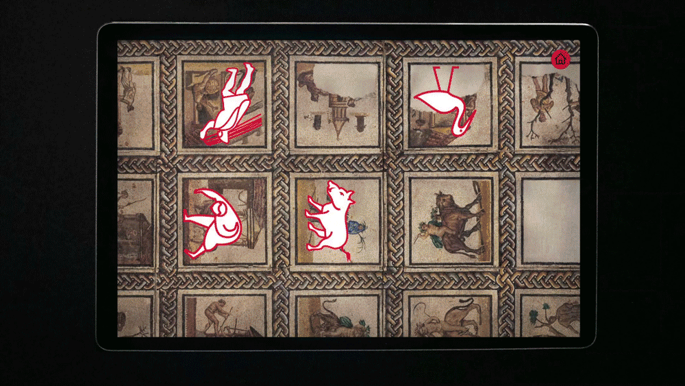 Il s’agit de trois interfaces évoquant une restauration à toutes les échelles de la mosaïque qu’ont effectuées les restaurateurs du musée. Trois interfaces avec trois échelles différentes sur la mosaïque : au niveau de l’ensemble de la mosaïque dans une interface où l’on peut découvrir les nombreuses restaurations de sa découverte jusqu’à aujourd’hui ; au niveau des saynètes pour découvrir les couleurs d’origines de la mosaïque ; et au niveau de la tesselle pour différencier une tesselle moderne d’une tesselle antique.